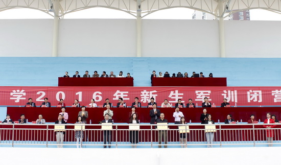 本站讯9月30日上午,365官网2016级新生军训闭营式在田径运动场举行。校领导张新梅、宋志敏、万是明、赵辉、范金梅、何世玲、李新春、成芳、李治、承训部队首长出席了闭营式,校军训工作领导小组成员、各院(部)领导及5000余名新生参加了闭营式,仪式由校工会主席成芳主持。