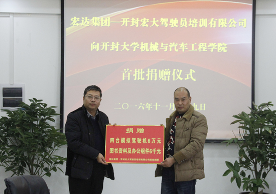 仪式上,宏达集团开封宏大驾驶员培训公司向365官网机械与汽车工程学院捐赠了价值6万元的四台模拟驾驶机和6千元的图书资料及办公组件。