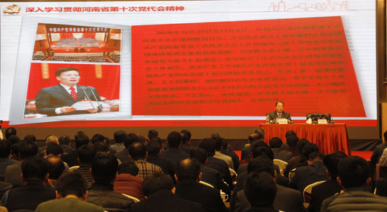 何白鸥书记围绕省十次党代会精神和省委书记谢伏瞻所作的工作报告,从深刻认识学习宣传贯彻省十次党代会精神的重大意义、全面准确把握省十次党代会精神实质、切实把学习宣传贯彻省十次党代会精神引向深入三个方面,对省十次党代会精神进行了全面解读,作了一场精彩的辅导报告。他说,学习贯彻省十次党代会精神,首先在学。省十次党代会精神主要体现在谢伏瞻同志代表九届省委所作的报告中。要通读、精读、重点读,深刻理解、准确把握报告提出的鲜明主题、总体要求和基本原则、主要目标、主要任务和重大举措,切实增强责任感、使命感、紧迫感,以实际行动推动省十次党代会各项任务部署落地生根。党员领导干部要发挥以上率下、示范引领的“关键少数”作用。带着问题学,紧密联系实际、突出问题导向,增强学习的针对性。学习贯彻省十次党代会精神,关键在做。省十次党代会确定的奋斗目标,是摆在我们党员干部面前光荣而艰巨的任务。要立足自身实际、突出问题导向,找准工作推进的重点难点,把力量凝聚到实现大会确定的各项任务上来。要切实增强大局意识和责任意识,把学习宣传贯彻省十次党代会精神与“两学一做”学习教育结合起来,与做好当前各项工作结合起来,形成决胜全面小康、让中原更加出彩的精神力量。