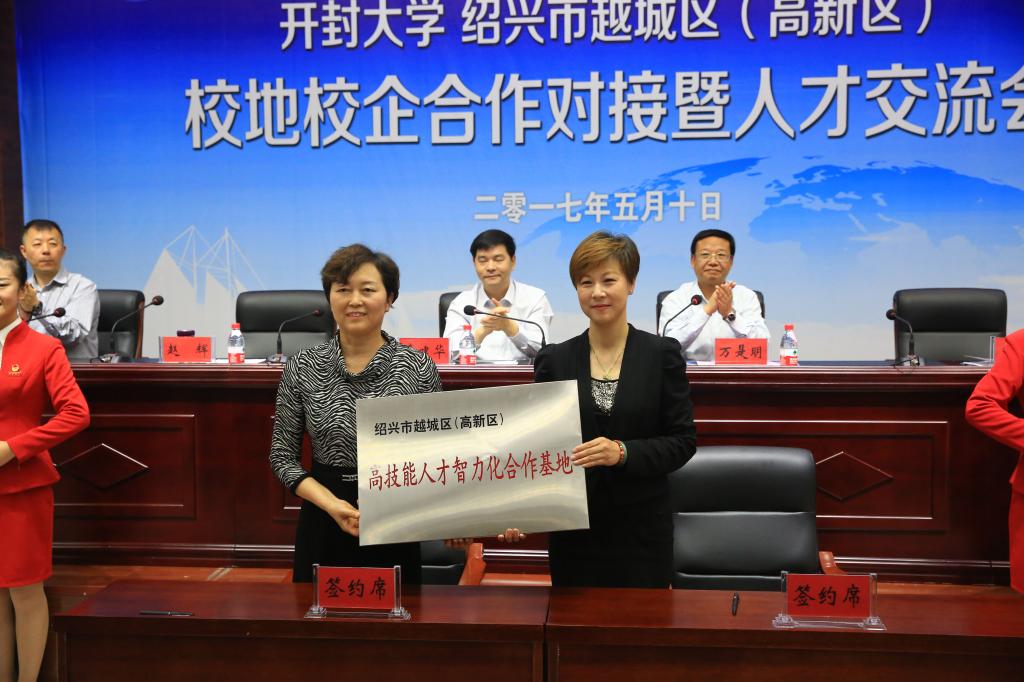 副校长赵辉代表365官网与绍兴市越城区副区长应建红签订“校企高技能人才智力转化与引培合作”合作协议,并接收“绍兴市越城区(高新区)高技能人才智力化合作基地”牌匾。