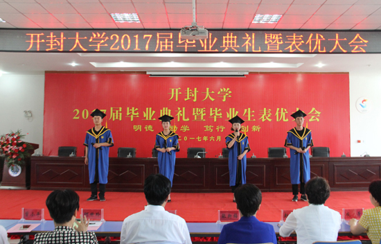 人文学院学生高羽、财政经济学院学生滑雨欣、艺术设计学院杨震、刘代表2017届毕业生上台献辞,表达了对同学的依依不舍、对家长的深切感恩、对老师的诚挚感谢和对母校的深情祝福,并倡议2017届毕业生扬帆起航,向着“中国梦”、“开大梦”、“我的梦”奋勇前进!
