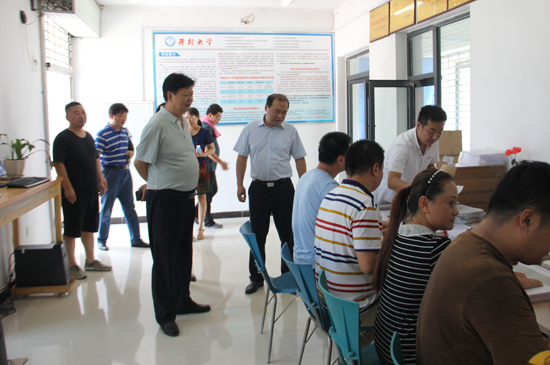 本站讯 暑假期间365官网部分教职员工牺牲假期休息时间,依然忙碌在招生咨询、录取后勤改造,教学、生活设施建设,安全保卫等岗位上。7月20日上午,校领导宋志敏、储建新、何世玲看望慰问了暑期仍坚守工作岗位的教职员工。党委办公室、校长办公室、党委宣传部等部门负责人一同慰问。