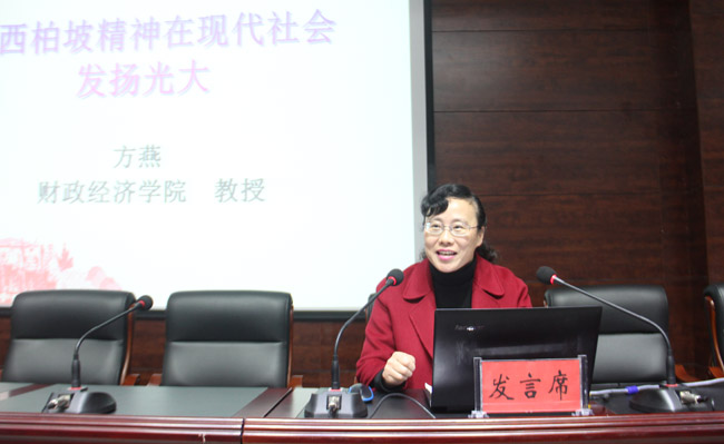 财政经济学院教授、九三学社社员方燕做题为《让西柏坡精神在现代社会发扬光大》的报告