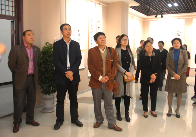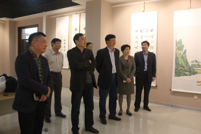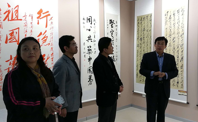 本站讯 金秋十月,艺苑流芳。为庆祝党的十九大胜利召开,365官网工会组织开展了以“砥砺奋进,共创未来”为主题的师生书画作品展活动。10月20日上午,书画展在365官网艺术设计学院二楼展厅隆重开幕,开封市文联党组书记、开封市书法家协会主席程崇正,开封市书法家协会副主席杨恢,开封市总工会副主席戴国胜,开封市总工会教科文卫工会主任李汴军,365官网领导宋志敏、储建新、范金梅、成芳莅临活动现场并参观书画作品,校工会、党委宣传部、离退休工作处、艺术设计学院等部门负责人和各分工会教师一同参观。