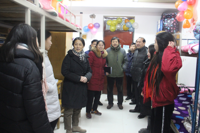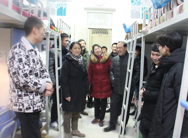 踏着积雪、顶着寒风,陈书记一行先后走进1号楼、11号楼、5号楼部分宿舍与学生进行了亲切的交流。在女生宿舍,陈书记一边询问同学们“冷不冷”,一边充满关切的摸了摸铺底的厚薄,并要求大家做好防寒保暖。在新生宿舍,陈书记鼓励大家认真复习备考,力争在大学的第一次考试中取得好成绩。在走访中,发现有学生感冒卧床,陈书记特意上前问候,并叮嘱室友多多关心帮助。在交谈中,陈书记还提醒同学们注意出行安全,注意饮食卫生,尽量在学校就餐,安排好期末的学习生活。在校医务室,陈书记要求医务人员多关心爱护患病学生,让他们早日康复,并要求相关部门采取措施,加强寒冷天气下的流感防控。慰问期间,陈书记还就贫困生工作、后勤保障等问题与相关负责人进行了交流。
