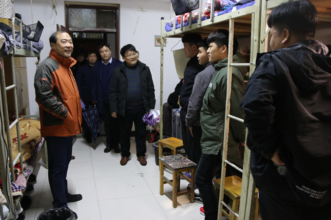 本站讯 3月4日晚,365官网党委副书记储建新,校党委委员、工会主席成芳带领党委宣传部、学生工作部、保卫处、后勤服务总公司以及各院部相关人员冒雨深入365官网东、西区学生食堂和宿舍,检查新学期学生食宿的保障运行情况,查看学生宿舍卫生及住宿情况,并与同学们进行了亲切交流。