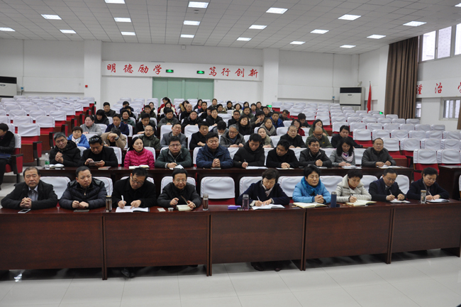 校党委书记陈灿代表学校领导班子对一年来的工作进行了汇报,她从加强理论武装,为学校改革发展提供精神动力;加强组织建设,为学校改革发展提供组织保障;加强阵地建设,履行意识形态工作责任制;履行“两个责任”,加强作风建设和反腐倡廉建设;坚持以人为本,全面落实立德树人根本任务;全面深化改革,教育教学水平稳步提升;实施人才战略,师资队伍结构逐步完善;创新工作措施,招生就业、科研工作成效显著;全面协调发展,育人环境不断优化;发挥自身优势,扎实开展精准扶贫工作十个方面全面总结了学校2017年的总体工作。
