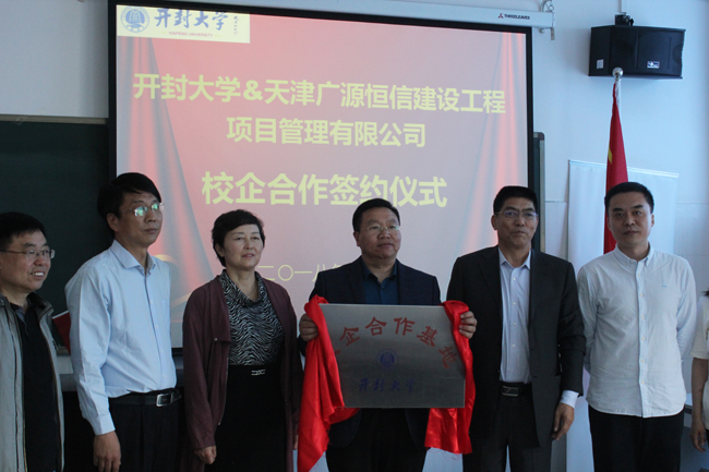 赵校长代表学校与天津广源恒信建设项目管理有限公司副总经理杜洋签订了合作协议,并一同为校企合作基地揭牌。