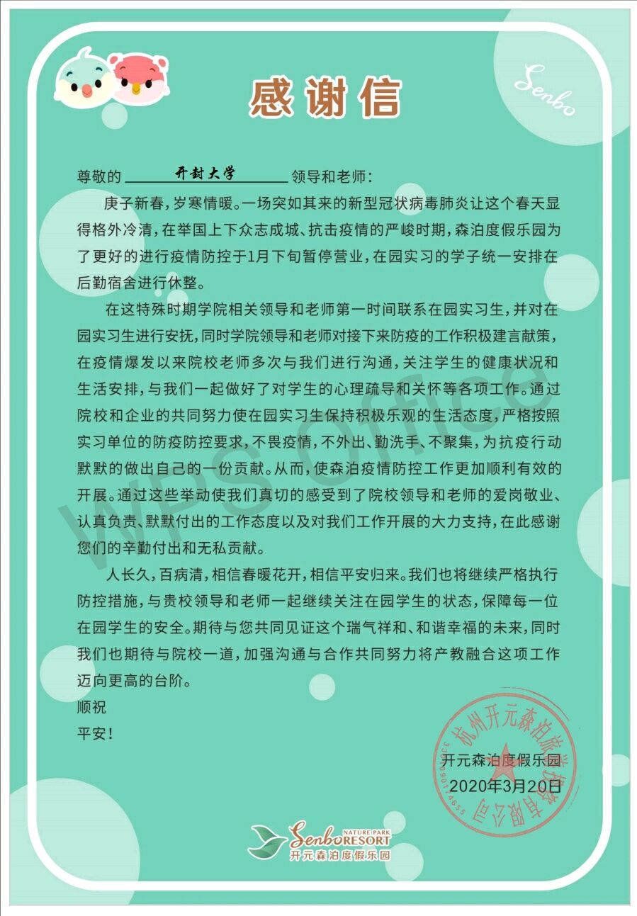 本站讯 3月23日,旅游学院校企合作单位浙江湖州市开元森泊度假乐园就我院17级顶岗实习生疫情防控工作发来感谢信,对学院在疫情期间对留在单位的实习学生就疫情防控和心理疏导等工作付出的努力表示由衷的感谢。