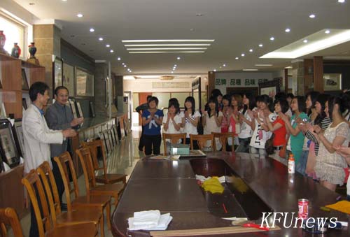 师生们首先认真倾听了汴绣厂厂长魏积安关于汴绣历史沿革及发展情况的介绍,然后兴致勃勃地到二楼的工作室观看了汴绣的绣制过程并详细询问了有关丝线色彩的选择、针法的运用等刺绣工艺问题,最后观看了关于汴绣的专题电视片并参观了汴绣艺术作品展厅。
