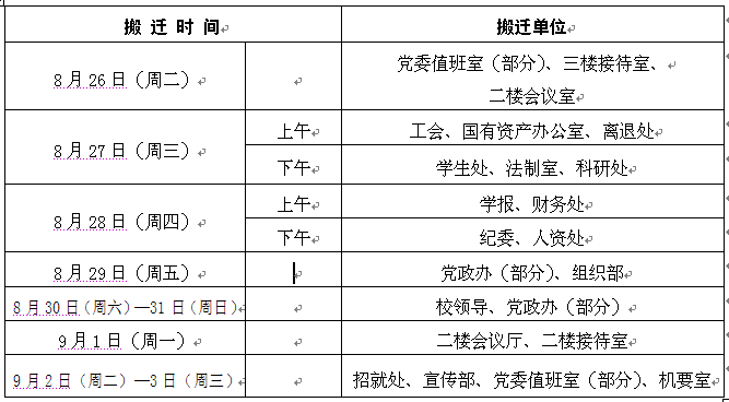 根据学校整体搬迁计划,初步定于8月27日开始整体搬迁,具体如下: