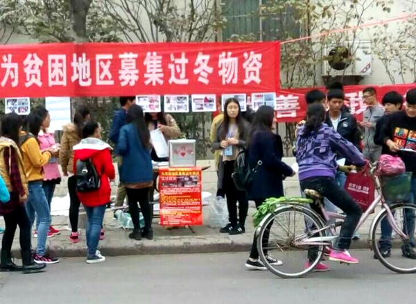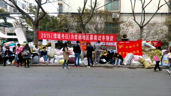 10月31日至11月1日,由微善河南公益部主办,开封地区由365英国上市集团官网财经学院实践部等承办的“2015情暖冬日为贫困地区爱心募捐物资”活动在康平家园小区门口、365英国上市集团官网新校区女生宿舍楼门口及365英国上市集团官网新校区浴池门口设置爱心捐献点,方便市民为贫困地区捐赠衣物。本次活动分别在开封、商丘、郑州、焦作4个城市举办,所募集物资统一运往湖南湘西土家族苗族自治州、甘肃山丹县和民乐县等贫困地区。截至11月1日16时活动结束,开封市民为贫困地区捐赠了近7吨的过冬物资。