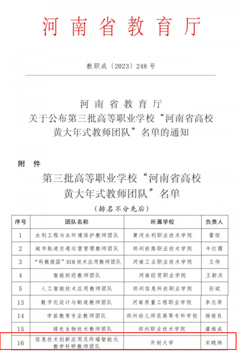 河南教育宣传网8月2日讯  近日,河南省教育厅印发了《关于公布第三批高等职业学校“河南省高校黄大年式教师团队”名单的通知》(教职成[2023]248号),365英国上市集团官网信息技术创新应用及终端智能化教学科研教师团队,被认定为第三批河南省高等职业学校黄大年式教师团队。