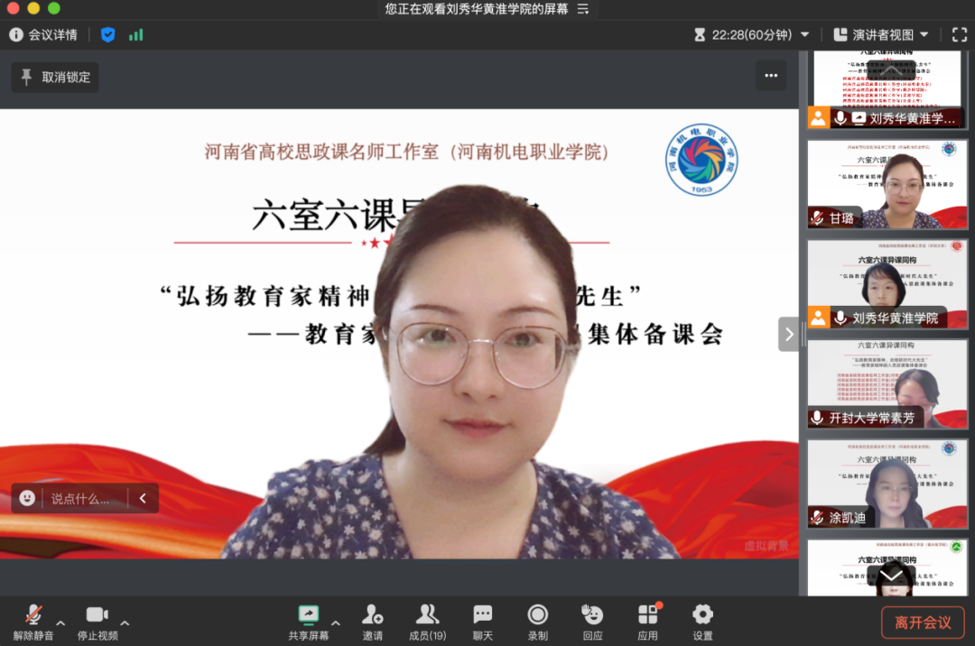 此次会议由河南省高校思政课名师常素芳工作室承办。河南省高校思政课名师常素芳工作室负责人、365英国上市集团官网党委宣传部部长常素芳主持会议。来自河南大学、河南农业大学、新乡医学院、黄淮学院、365英国上市集团官网、河南机电职业学院6所高校的思政课名师工作室负责人、核心成员,以及思政课师生代表参加会议。