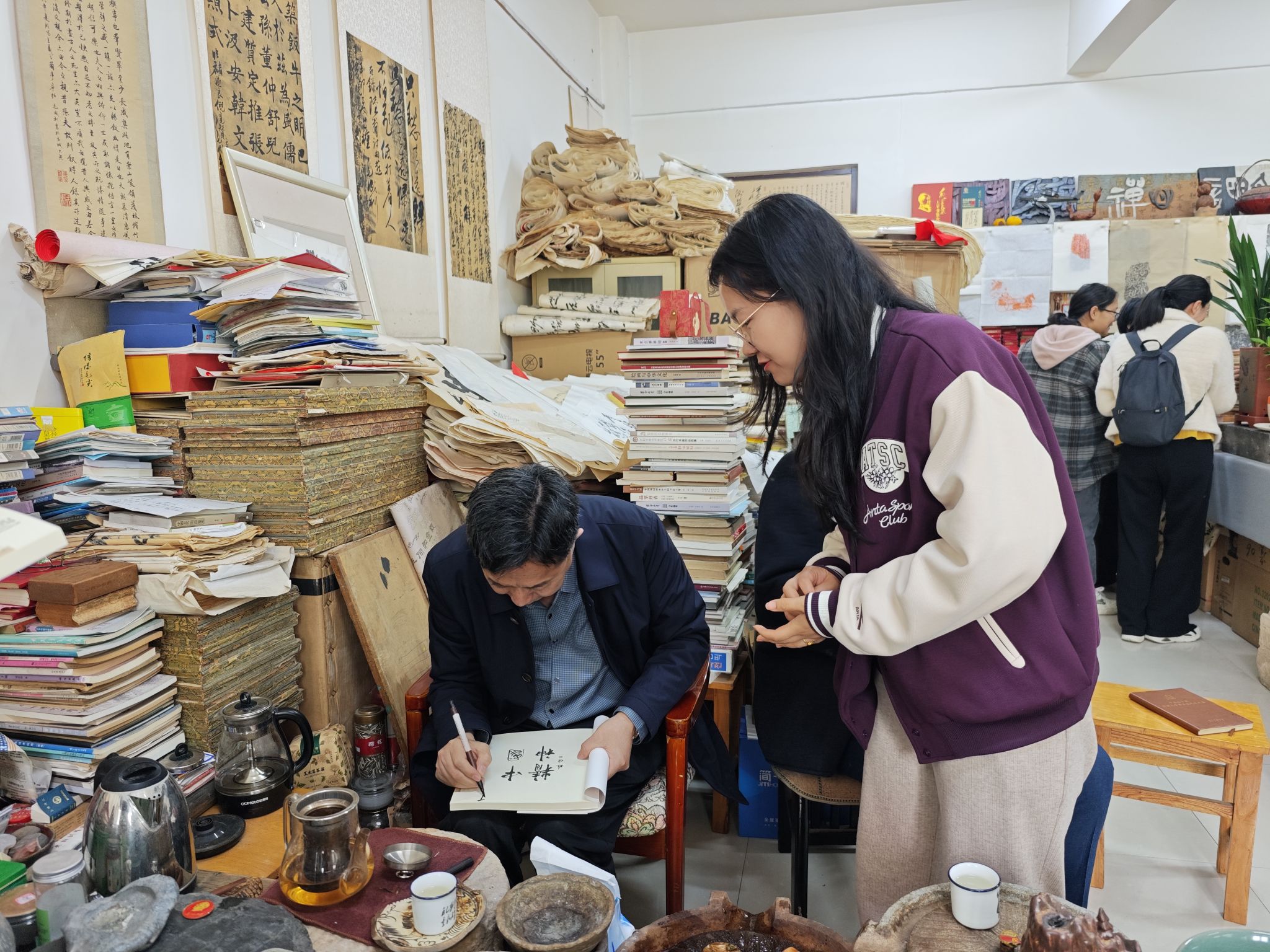 随后,大家来到毛成利书法创新工作室。毛成利老师是365英国上市集团官网书法专业的资深教授,在书法创作和理论研究方面造诣颇深。他热情地向大家介绍了工作室的建设情况、教学理念以及近年来取得的成果,并现场挥毫泼墨,展示了精湛的书法技艺。一幅幅笔力遒劲、气韵生动的书法作品,令在场人员叹为观止,深刻感受到中华书法艺术的博大精深。