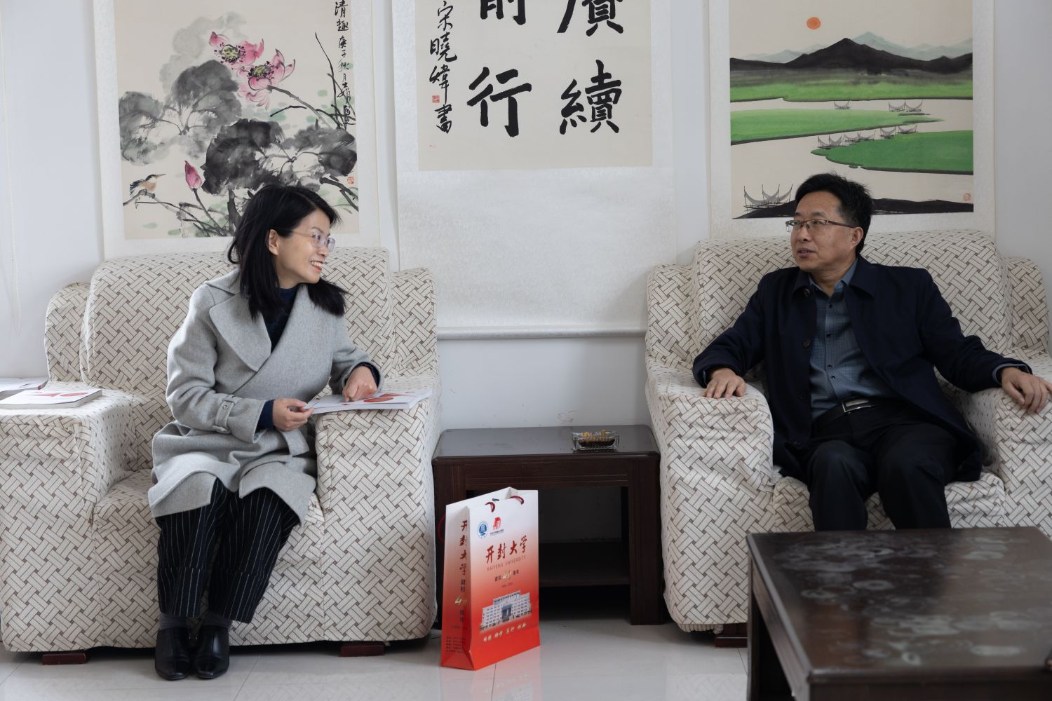 刘善花主任与毛成利老师亲切交谈书画艺术合作事宜