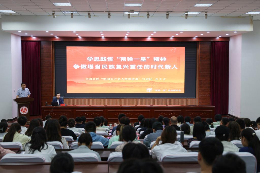 孔令才将军是中国国史学会“两弹一星”历史研究会常务副理事长、全国高校“中国共产党人精神谱系”宣讲团专家。他从“两弹一星”精神源自伟大的历史使命、彰显伟大的民族品格、折射伟大的人生追求、照亮伟大的复兴之路四个方面,通过大量珍贵的历史图片和影像资料,生动讲述了钱学森、邓稼先、郭永怀、林俊德等诸多科学家在大漠戈壁、科研前线终其一生为国防献身、为民族立柱的感人事迹,深刻诠释了“两弹一星”精神的内涵要义和时代价值。并勉励在座师生将“两弹一星”精神内化于心、外化于行,在刻苦钻研、求是创新中磨练坚强意志。