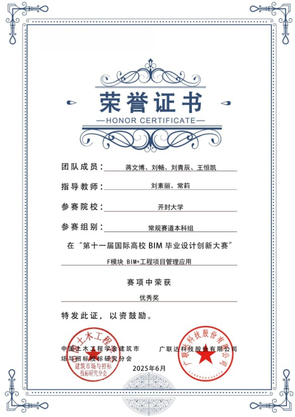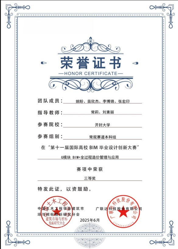据悉,国际高校 BIM 毕业设计创新大赛作为全国规模最大、覆盖专业最广的高校建筑专业顶级赛事之一,连续多年荣登《普通高校大学生竞赛排行榜》,备受行业关注。本次大赛自20249月启动以来,吸引了国内外1.4余支团队、8余名师生参与,共提交作品4400余份。经综合评审,由常莉、刘素丽两位老师指导的“砼济大学”团队(22土木姚盼、苗欣杰、李博锦、张宏印与“空间编织者”团队(22土木蒋文博、刘畅、刘青辰、王恒凯分别荣获G模块BIM+全过程造价管理与应用赛项三等奖1项、F模块BIM+工程项目管理应用赛项优秀奖1项。