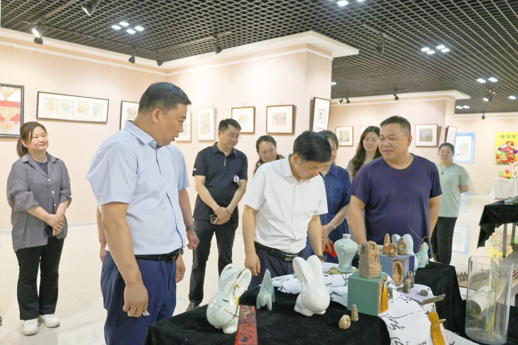 展览现场,王校长仔细观赏每一件参展作品,与师生深入交流,详细了解作品设计理念、文化内涵和制作流程。王德如对作品中体现的创新思维和毕业生扎实的专业技能予以高度评价,对艺术设计学院教学、管理等各项工作给予充分肯定,他指出艺术设计学院探索以设计赋能地方经济建设、推动作品向产品转化的实践模式,非常有创意有特色。
