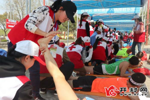 核心提示:12点左右,龙亭公园人满为患,尤其是按摩拉伸处,接踵而来的运动员让志愿者们忙得应接不暇,不少志愿者耐着饥渴继续工作。比赛期间,不时有运动员出现呕吐,晕厥现象,流动的红十字志愿者随叫随到,第一时间对运动员进行抢救。