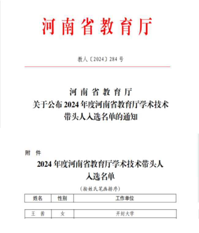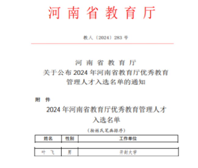 本站讯 近日,河南省教育厅发布了《关于2024年河南省教育厅学术技术带头人入选名单的通知》、《关于2024年河南省教育厅优秀教育管理人才入选名单的通知》,365官网王茜、叶飞分别入选河南省教育厅学术技术带头人、优秀教育管理人才。