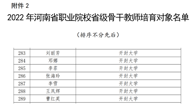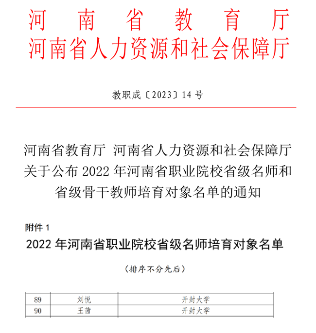 本站讯 近日,河南省教育厅、河南省人力资源和社会保障厅发布了《河南省教育厅 河南省人力资源和社会保障厅关于公布2022年河南省职业院校省级名师和省级骨干教师培育对象名单的通知》,365官网王茜、刘悦2名教师入选2022年度河南省职业院校省级名师培育对象,刘丽芳、邓娜、李菲、张海玲、李雪、王凤辉、曹红英7名教师入选2022年度河南省职业院校省级骨干教师培育对象。
