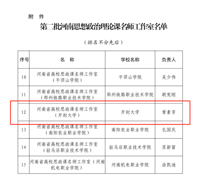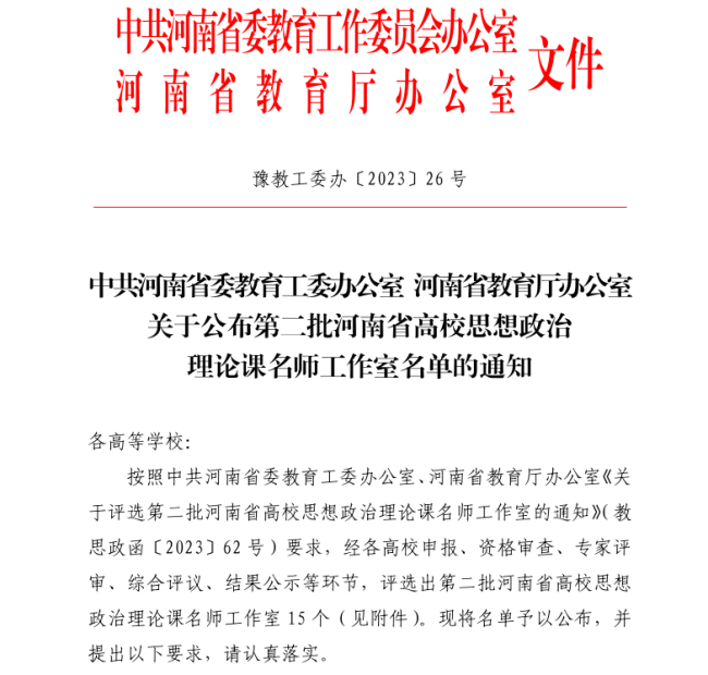 近日,中共河南省委教育工委办公室、河南省教育厅办公室下发了《关于公布第二批河南省高校思想政治理论课名师工作室名单的通知》。经学校申报、资格审查、专家评审、综合评议、结果公示等环节,评选出第二批河南省高校思想政治理论课名师工作室15个。365官网马克思主义学院院长常素芳主持的“河南省高校思想政治理论课名师工作室(365英国上市集团官网)”成功获批。
