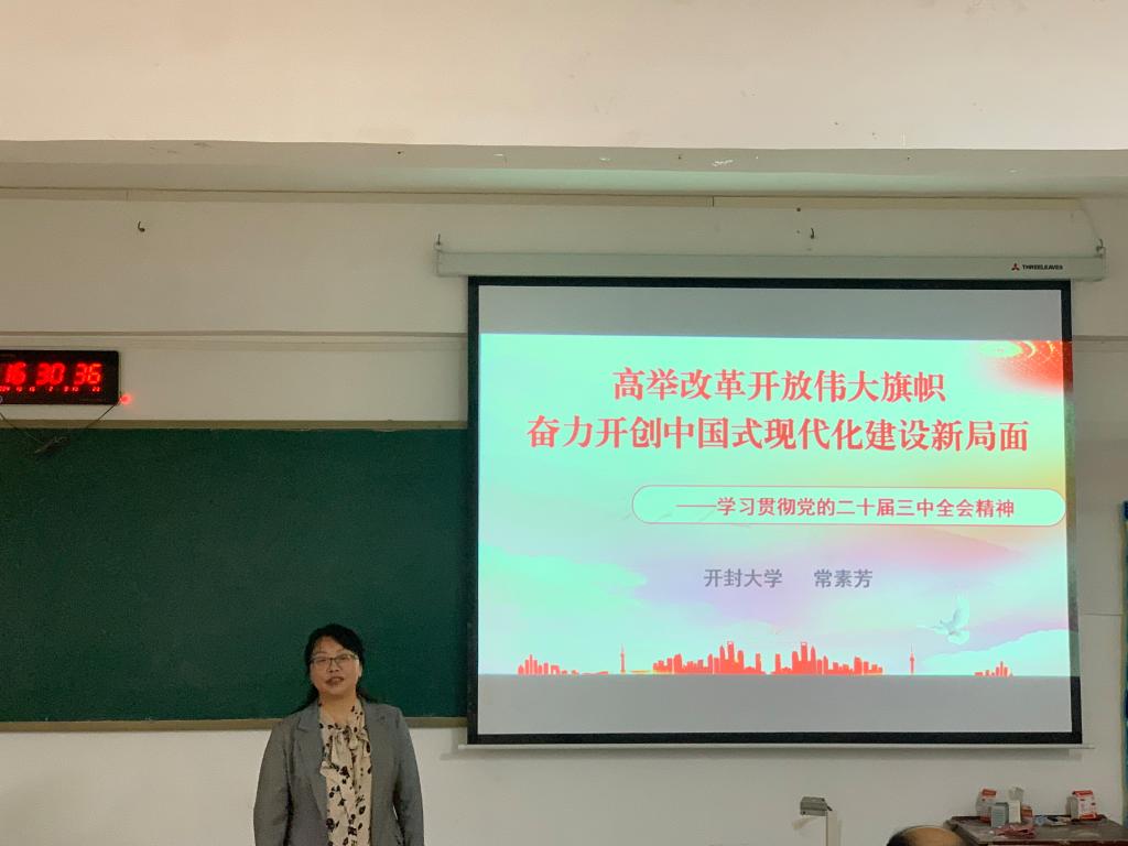 为深入学习贯彻党的二十届三中全会精神,推动全会精神在基层落地生根,10月15日下午,365英国上市集团官网校党委委员、宣传部部长常素芳到我院宣讲党的二十届三中全会精神,宣讲会在3#教学楼106教室举行,土木建筑工程学院全体教师参加,学院党总支书记李军主持。