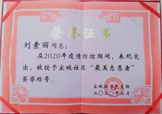 作为一名具有十六年党龄的教师党员,我院刘素丽老师放弃春节假期休息时间,主动到宋城社区报到,成为一名疫情防治志愿者,协助社区工作人员做好人员登记、入户排查、卡扣值守、防疫知识宣传、公共场所和设施消杀等多项工作,冲在疫情防控的第一线。在疫情防控最紧张期间,刘老师每天早出晚归,顾不上照顾年幼的孩子,全身心投入紧张的防疫工作中。心中虽有牵挂,但战“疫”当前,“随时准备为党和人民牺牲一切”的誓言和共产党员的身份,让刘老师坚定的做一名勇敢冲锋的“逆行者”,用实际行动践行了共产党员的初心和使命。由于工作突出,刘素丽老师被宋城社区党支部授予“最美志愿者”的荣誉称号。