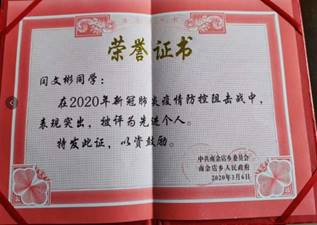 同样,我院2018级建设工程管理专业、家住驻马店市汝南县南余店乡的闫文彬同学,主动加入到村里的疫情防控队伍中。每天在村头卡点站岗执勤,严防人员出入,又要经常到村里巡查,劝导村民不要外出,防止群众扎堆聚集,还要到村庄进行保洁、消毒消杀。面对防疫意识淡薄的村民,闫文彬发挥大学生志愿者的优势,不厌其烦的向村民讲解疫情防治的政策和知识。由于出色表现,得到了当地政府的充分肯定,被评为疫情防控 “先进个人”。