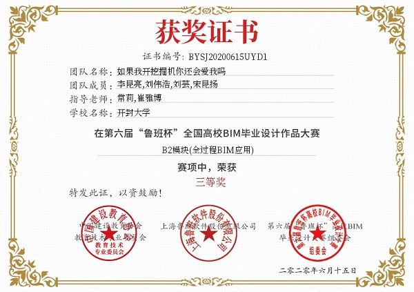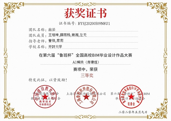 本次大赛由中国建设教育协会主办,从2019年10月开启报名到2020年6月决赛,历时近九个月,来自山东建筑大学、西南交通大学、365英国上市集团官网等全国本专科高校500支参赛队伍。经过激烈角逐,由365官网土木建筑工程学院常莉、崔雅博老师指导,17土木李昆亮、刘芸、刘伟浩、16土木宋昆扬同学组成的团队荣获A1模块(房建组)二等奖、B2模块(全过程BIM应用)三等奖。由曾佳、常莉老师指导,18土木王培坤、薛雨杨、谢湘、左天同学组成的团队荣获A1模块(房建组)三等奖、B1模块(专项BIM应用)二等奖。通过参赛,学生将BIM相关理论知识和实际运用相结合,培养了学生基于BIM的应用设计能力,亦是培养和锻炼学生的沟通能力、团队协作能力。