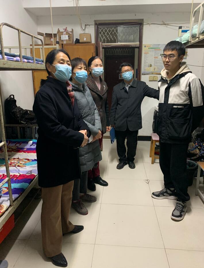 在3#宿舍楼,陈书记首先查看了宿舍疫情防控措施的具体落实情况,检查了消防器材配备的情况,并指出要加强消防知识培训,让同学们了解和掌握消防器材的使用和操作方法。在宿舍,陈书记一行与同学们进行了亲切的交谈,详细了解了同学们的生活、学习情况。陈书记还仔细查看了宿舍张贴的防疫小贴士、晨午晚检登记表等疫情防控资料,叮嘱同学们要严格遵守宿舍管理规定,提高个人防护意识,加强个人卫生管理,注意用水用电安全和防电信诈骗,希望同学们养成良好的生活、学习习惯,营造整洁高雅、健康文明和勤奋向上的寝室环境。