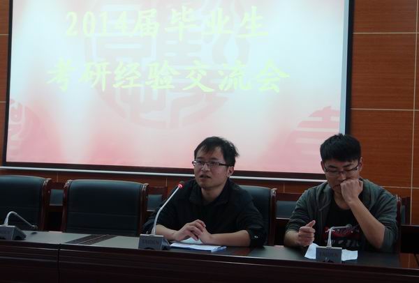 党总支副书记王磊随后向到会同学介绍了2010级学生的考研情况,今年是我院考研学生录取最多的一年,也是录取院校质量最高的一年。录取院校中有南京工业大学等多所211院校。他鼓励同学们应以学习为第一要务,把握学习机会,不断提升自己。随后10土木工程班薛善刚和10房产班孟媛美等5位考研成绩优异的同学代表发表了精彩的演讲,对在考研过程中获得的经验与教训与在座的同学们进行了分享。在互动环节中,各位学长耐心细致地回答了同学们对考研的种种疑问,使备考同学更加坚定了自己的目标。