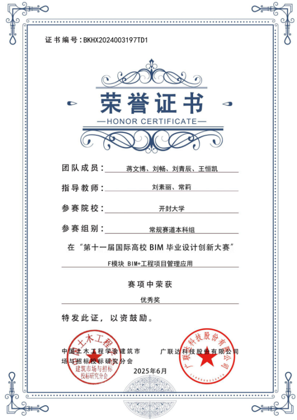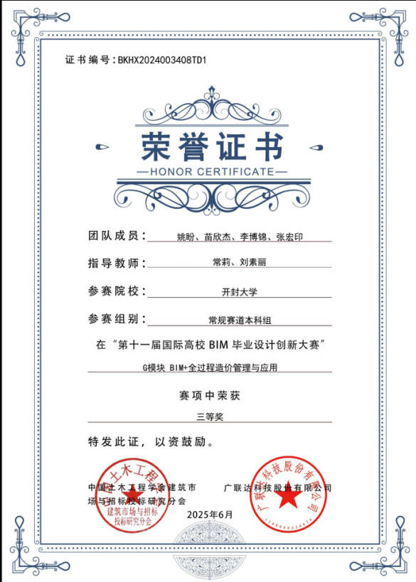国际高校 BIM 毕业设计创新大赛作为全国规模最大、覆盖专业最广的高校建筑专业顶级赛事之一,连续多年荣登《普通高校大学生竞赛排行榜》,备受行业关注。本次大赛自 2024 年 9 月启动以来,吸引了国内外 14000 余支团队、80000 余名师生踊跃参与,共提交作品 4400 余份。经 1000 余位院校与企业专家严格的线上综合评审,由常莉、刘素丽两位老师指导的砼济大学团队(22土木姚盼、苗欣杰、李博锦、张宏印)、空间编织者团队(22土木蒋文博、刘畅、刘青辰、王恒凯)分别摘得G模块BIM+全过程造价管理与应用赛项三等奖 1 项、F模块BIM+工程项目管理应用赛项优秀奖 1 项。