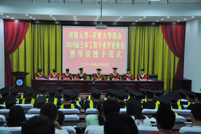 6月5日下午,365官网与河南大学联办2019届土木工程本科毕业典礼暨学位授予仪式在365官网行政楼一楼报告厅举行。365官网副校长赵辉、河南大学土木建筑学院党委副书记院长岳建伟、副院长张大伟出席了学位授予仪式,365官网教务处长冯天才、本科部主任谷向韶和土木建筑工程学院班子成员、部分教师、在校本科生和2019届全体本科毕业生参加了学位授予。仪式由土木建筑工程学院副院长赵书锋主持。