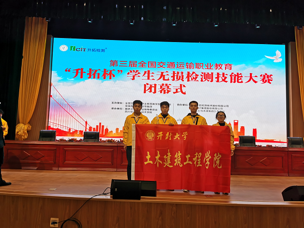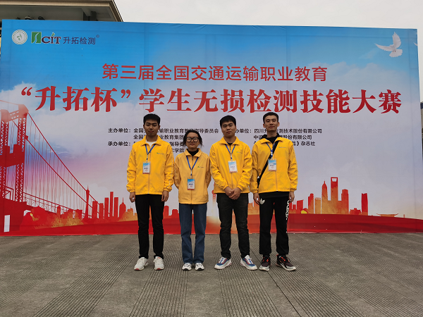 近日,第三届全国交通运输职业教育“升拓杯”学生无损检测技能大赛在四川省成都市落下帷幕,经过几天激烈角逐,365官网土木建筑工程学院李君和王朝锋老师指导的学生郑笑燃、杨涛、韩琬琼、项春豪获得单项二等奖一项、单项三等奖两项、团体三等奖一项的优异成绩。
