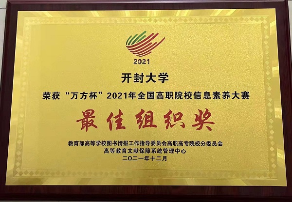 教育部高等学校图书情报工作指导委员会高职高专院校分委员会与高等教育文献保障系统管理中心组织的全国高职院校信息素养大赛是贯彻《职业教育改革实施方案》、《教育信息化 2.0 行动计划》、《普通高校图书馆规程》有关文件精神,落实《高等学校数字校园建设规范(试行)》关于开展信息素养教育的总体要求,持续推动全国高职院校信息素养教育工作而开展的。365官网广泛宣传、积极动员、分类指导,组织80多位学生完成了校级选拔赛,5名学生晋级省赛,2名学生在省赛中脱颖而出冲击到国赛,图书馆荣获教育部颁发的“最佳组织奖”。