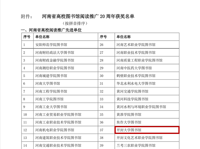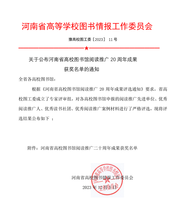 近日,河南省高校图书情报工作委员公布了河南省高校图书馆阅读推广20周年成果获奖名单,365官网图书馆荣获“河南省高校阅读推广先进单位”称号,1项阅读推广案例获“河南省高校图书馆优秀阅读推广案例”称号。