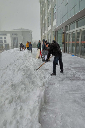 在老师们的带领下,部分学生也加入到了扫雪的队伍中,很快就清扫出一条安全通道,保障了图书馆的正常开放,方便了全校师生入馆读书学习。