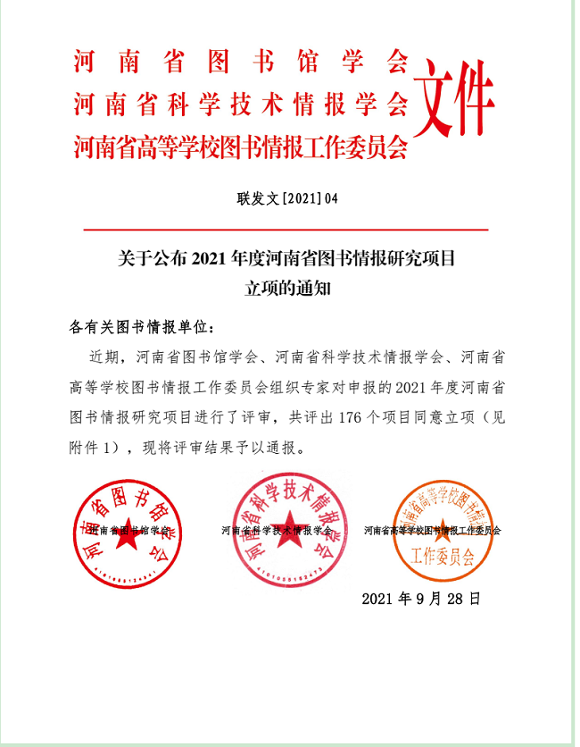 近日,河南省图书馆学会、河南省科学技术情报学会、河南省高等学校图书情报工作委员会组织相关专家对申报的2021年度河南省图书情报研究项目进行了评审,共评出 176 个项目同意立项。