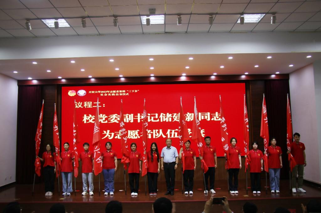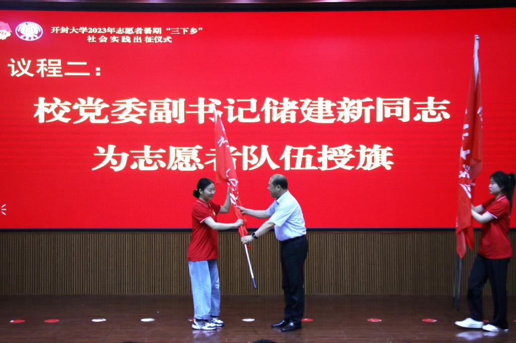 校党委副书记储建新为即将出征的志愿服务队授旗。