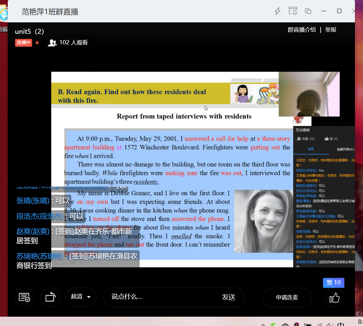 尽管做足了线上授课的准备工作,但教了这么多年书,还是第一次以直播的方式上课。直到上课之前,她还在担心网络是否会崩溃、软件是否会瘫痪、学生是否会按时上线、学生是否会认真听讲等等一系列令她担忧的问题。2月27日,她怀揣几分忐忑,带着多手准备、N个方案(以防网络崩溃、软件瘫痪等突发状况),走进直播间,没想到学生们瞬间爆屏问候老师,互动热情远远超出意料,整个上课过程师生交流顺畅,学生们积极参与网上讨论发言,课前所有的担心和制定的应急预案成为多余。