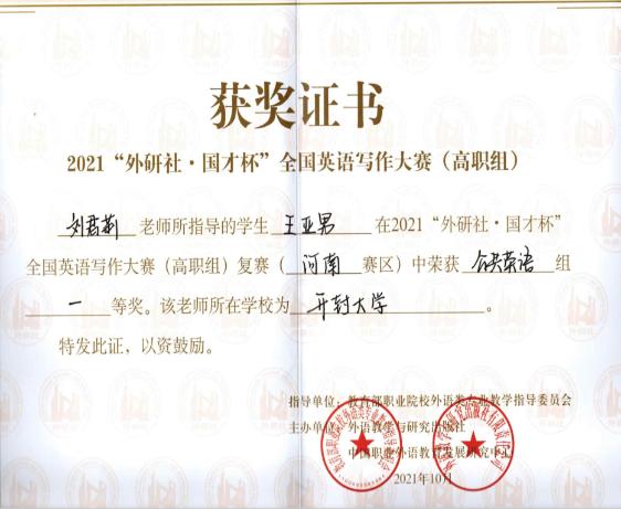 近日,2021“外研社·国才杯”全国英语写作大赛(高职组)河南省复赛在黄河水利职业技术学院举行。365官网外国语学院张秀芳老师指导的20级应用英语专业3班学生许乐华荣获英语专业组二等奖。公共外语教师刘君莉和顾军指导的人文学院19级新闻采编与制作一班学生王亚男和20级文化创意与策划一班学生赵莹分别荣获公共英语组一等奖和二等奖。