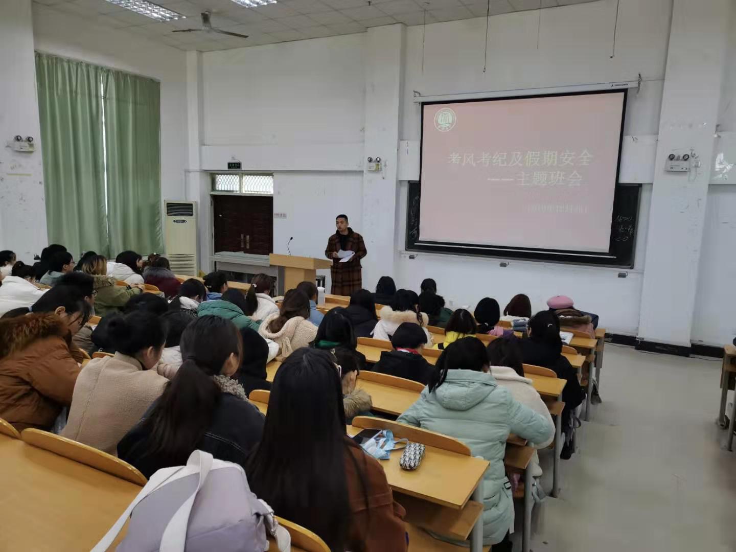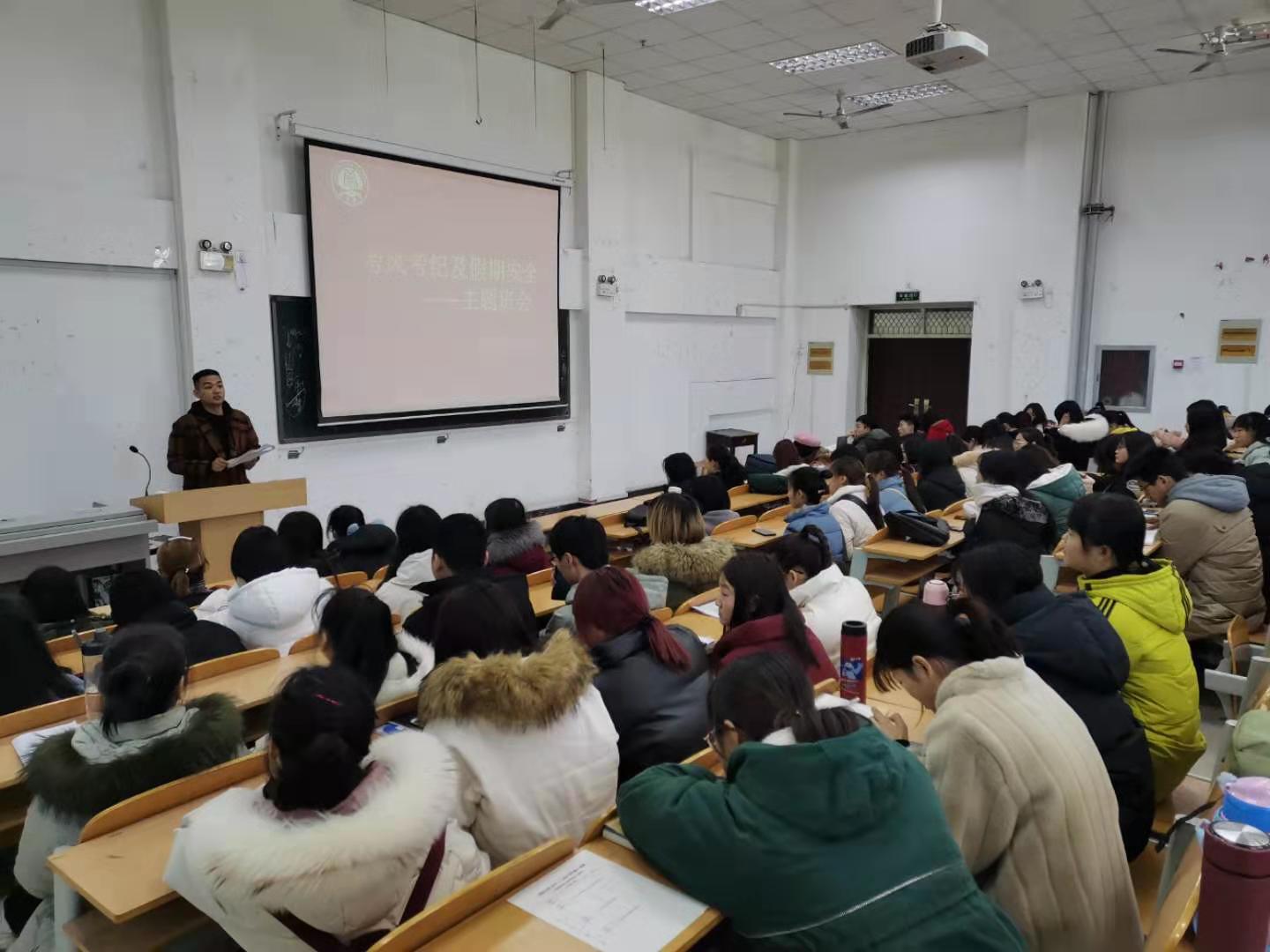 为严肃考风考纪,增强学生的诚信意识,12月25日和26日中午,外国语学院辅导员组织各年级学生在17号楼508教室召开“考风考纪暨寒假安全教育主题班会”。