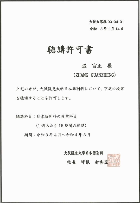 我院2018级应用日语专业学生张官正同学获得日本大阪观光大学入学许可