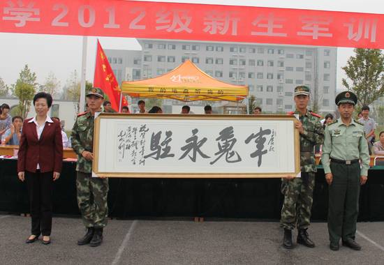 副校长万是明代表学校党委、行政讲话。万校长首先向承训部队首长、教官表示诚挚的感谢,并向圆满完成军训任务的新生表示热烈的祝贺!万校长说,经过为期11天严格的军事训练,四千余名新同学圆满完成了各项训练任务,希望同学们以这次训练为契机,以教官为楷模,以严谨的作风为准绳,将自强不息的精神,投入到以后的学习和生活中去,以良好心态去接受人生的挑战。奋发学习,挑起建设祖国的重担。