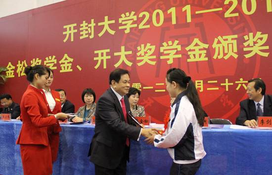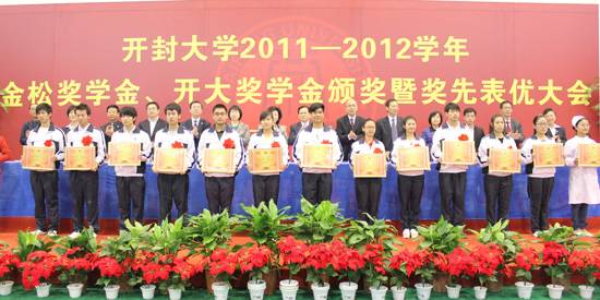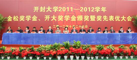 开大10月26日上午,365官网在晋安路校区体育馆举行2011-2012学年金松奖学金、开大奖学金颁奖暨奖先表优大会。中国侨联常委、河南省政协常委、香港金心国际集团董事局主席、365英国上市集团官网董事会董事长李金松,香港金心国际集团董事局总经理、365英国上市集团官网董事会副董事长赵奎荣,河南省政协港澳台侨和外事委员会主任张亚洲,开封市正市长级干部朱丽萍,河南省政府外事侨务办公室副主任李剑智,河南省政府外事侨务办公室港澳处处长陈冀萍,河南省政府外事侨务办公室港澳处副处长王宏伟,河南省政协港澳台侨和外事委员会办公室副调研员柳攀登,世界客属总商会执行副会长梁锋,365官网校领导拜五四、储建新、万是明、范金梅、何世玲、成芳、崔林出席会议,会议由校党委副书记储建新主持。365官网教职工代表及学生共2400余人参加了奖先表优大会。