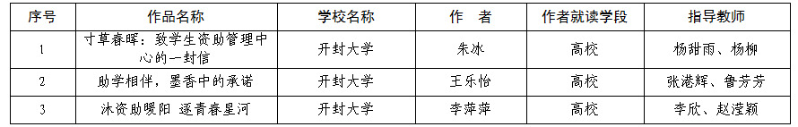 根据《河南省教育厅等五部门关于举办第18届河南省“诚信校园行”学生资助宣传教育活动的通知》文件精神,365官网组织开展了2025年“诚信校园行”学生资助宣传教育活动,进行了征文作品征集和评选,学生资助管理中心共收集到作品299份,经学院评选推荐、学生资助管理中心初选、学工委评审等,拟推荐3份优秀作品参加河南省“诚信校园行”学生资助宣传教育活动,现予以公示。