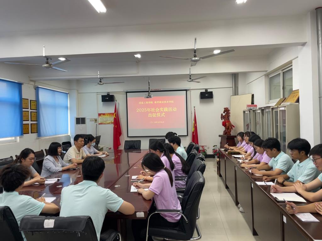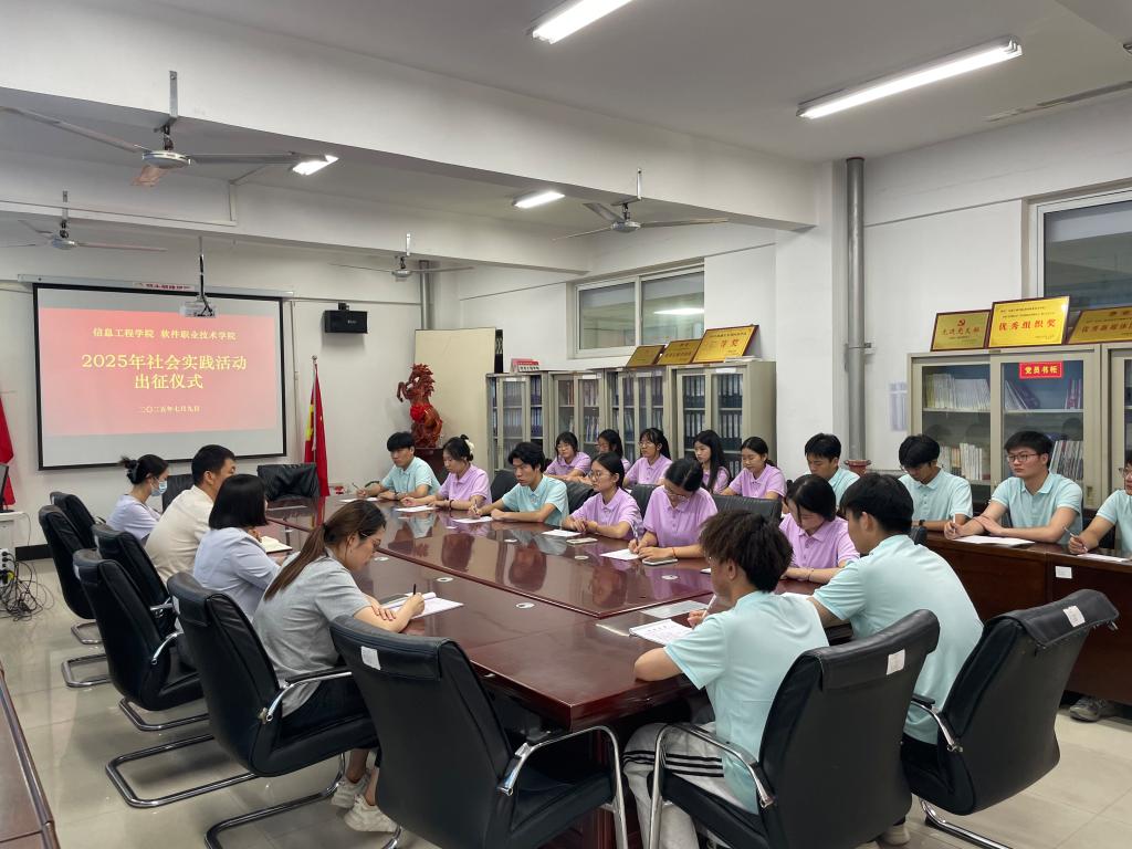 本站讯 7月9日,信息工程学院(软件职业技术学院)在3号楼312会议室举行2025年暑期社会实践活动出征仪式。学院党总支书记武莹,副书记陈茜,团总支书记贺钰,实践分队指导老师高俊笑、雷文杰和各实践分队全体同学参加了出征仪式。
