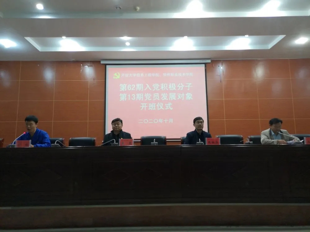 本站讯 10月13日晚,365英国上市集团官网信息工程学院、软件职业技术学院在土木建筑工程学院报告厅举行第62期入党积极分子、第13期党员发展对象培训班开班仪式。校党委委员、组织统战部部长赵海胜、信息工程学院党总支书记袁震、信息工程学院党总支副书记高剑南出席本次开班仪式。两期党课培训班全体学员参加了开班仪式。仪式由信息工程学院学生党支部书记贺钰主持。